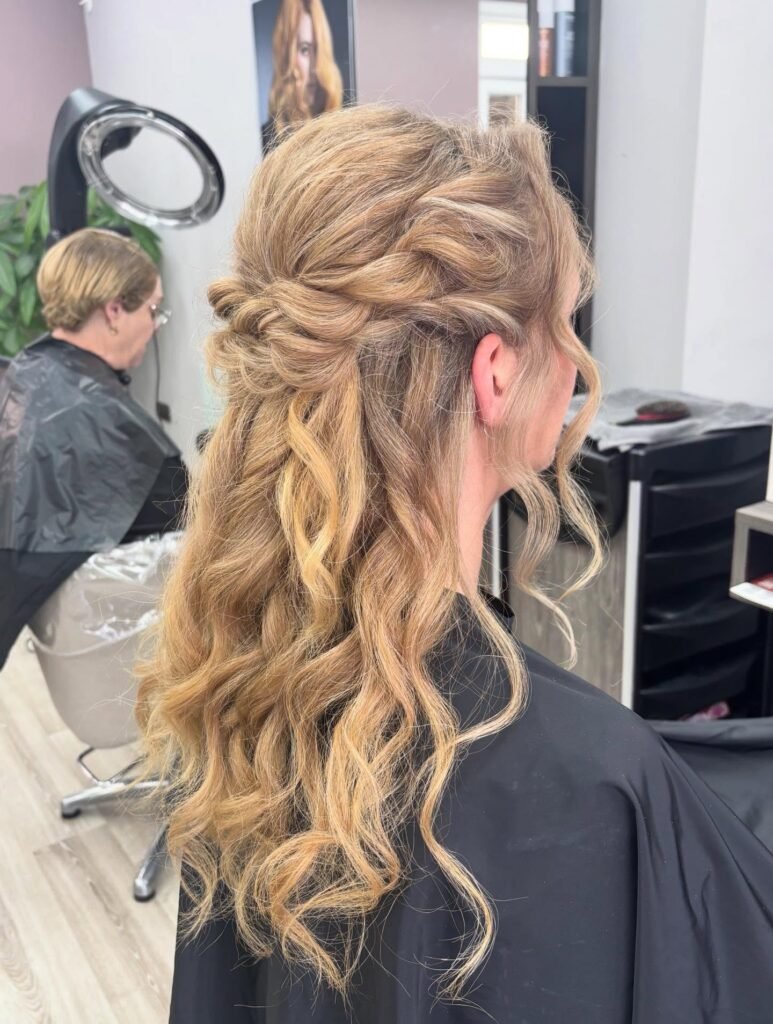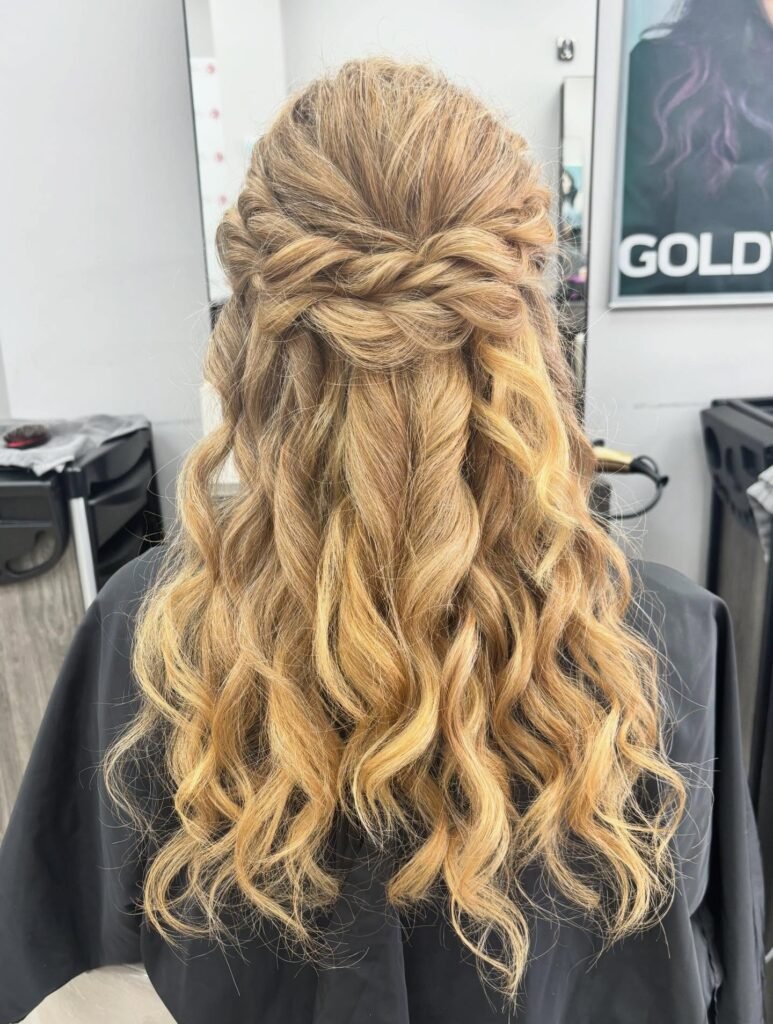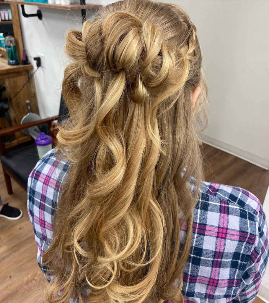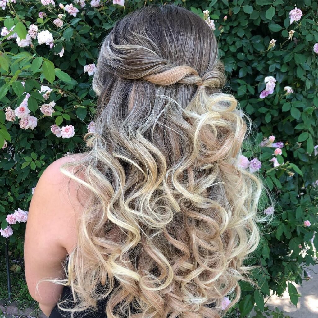 If your prom has an outdoor or garden theme, stop right here because this style was practically made for it. A relaxed horizontal twist across the back secures the top layers beautifully while a sea of platinum and honey-blonde ringlets cascades freely below. The contrast between the structured twist and the flowing curls is absolutely gorgeous, and the whole thing has this effortless, natural quality that still feels very special and intentional.