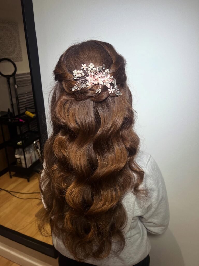 For the girl who wants to show off her gorgeous length while still having that updo feel at the crown, this one is perfect. Voluminous mahogany waves flow freely while the top section is elegantly gathered and secured with a stunning rose-gold and pearl floral vine that acts as the most beautiful focal point. It bridges the gap between a structured style and a fairytale cascade in the most enchanting way. Romantic, feminine, and completely unforgettable.