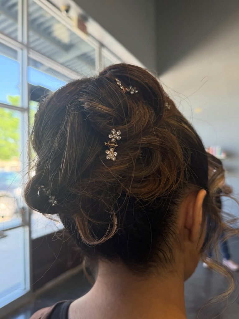 Saving one of the most sparkling styles for last. Chestnut hair is twisted into a voluminous, textured bun at the nape and accented with several dainty crystal flower clips scattered throughout like little stars catching the light. It is sophisticated, it is elegant, and it is going to look absolutely magical under the prom venue lights all night long. If you want an updo that adds just the right amount of sparkle without going overboard, this is the perfect choice to end your prom night on a high note.