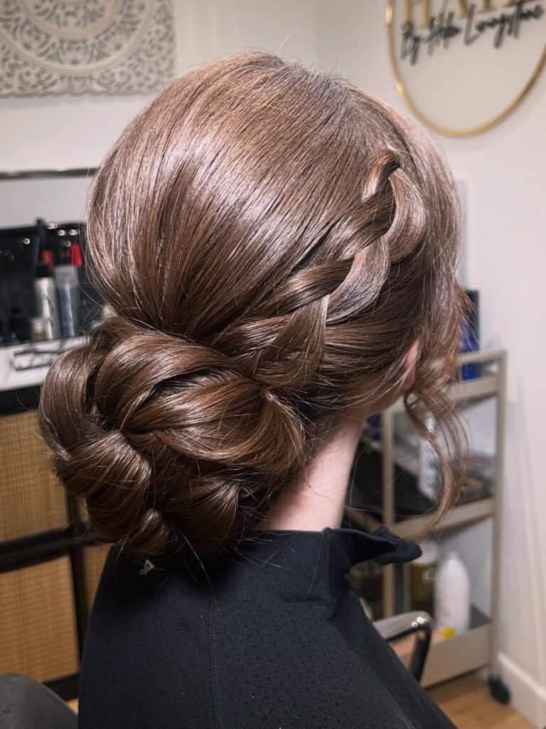 This one is so versatile and so flattering on every face shape. Thick horizontal twists gather the hair at the back into a crown-like effect, and the bottom layers are curled into loose, romantic waves that cascade beautifully below. A few face-framing pieces left out around the profile soften the whole look just enough to keep it feeling personal and pretty rather than stiff. A really wonderful choice if you are not sure what style direction to go in.