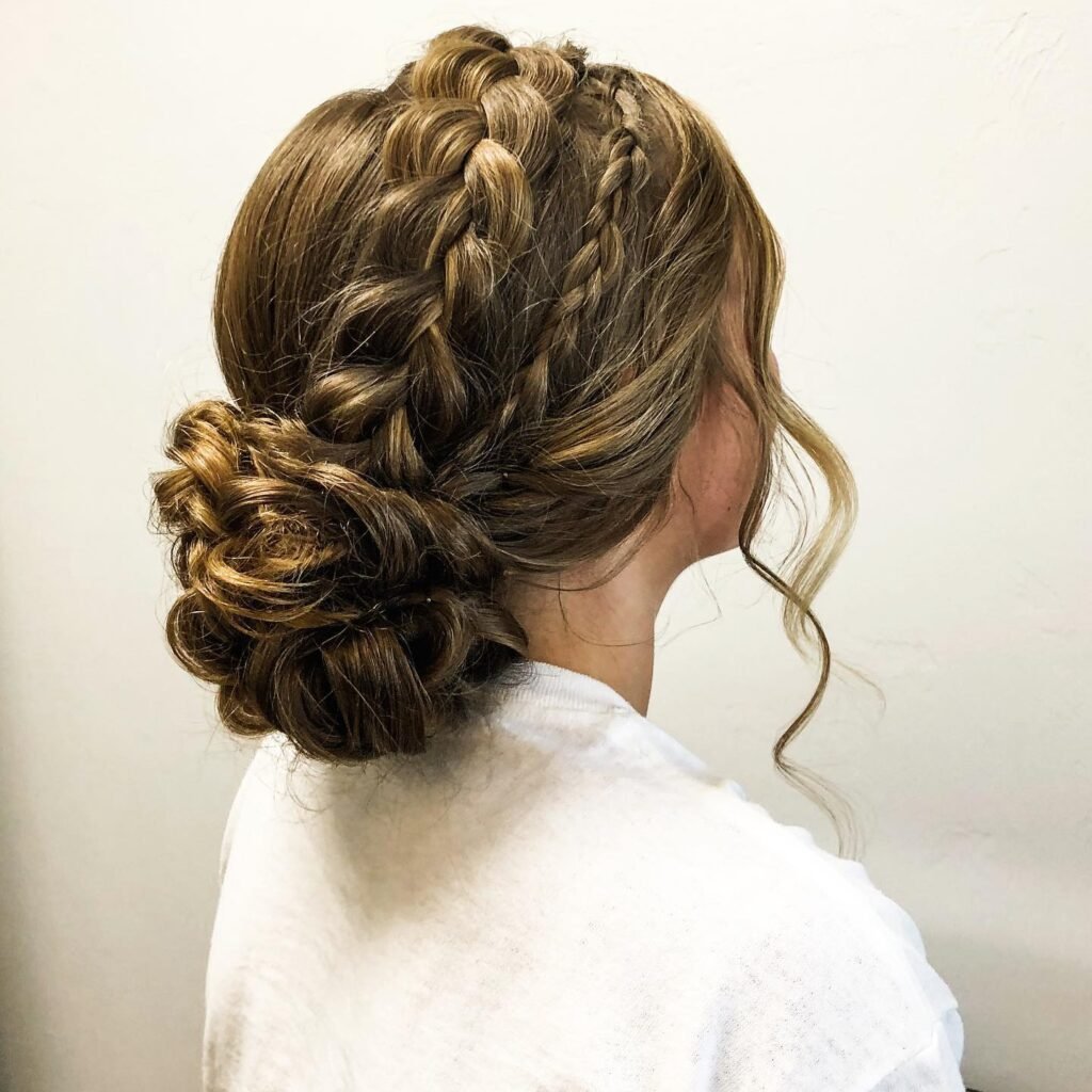 This one has the most beautiful bohemian energy. Three distinct braids, a thick Dutch braid, a medium standard braid, and a delicate micro-braid, all sweep back together into a large, voluminous messy bun at the nape. Soft spiraled tendrils left framing the face give the whole look that effortless forest-princess aesthetic that is just so dreamy. If you love texture, dimension, and a little bit of wildness in your hair, this is going to be your favorite style on this entire list.