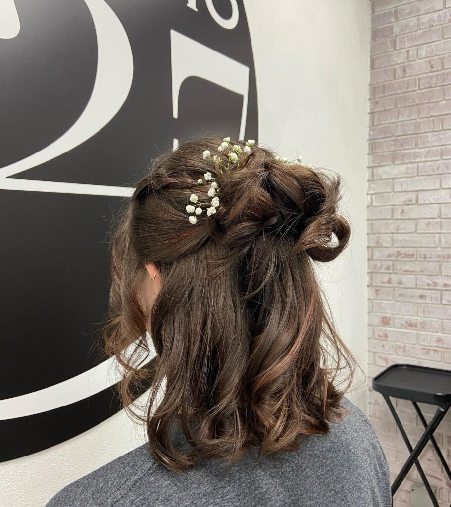 This one is so fresh and so uniquely pretty. The top half of the hair is gathered into a textured knotted bun at the back, and delicate sprigs of baby’s breath are tucked into the twists for the most charming nature-inspired touch. The remaining hair is left in soft, undone waves that keep the whole look feeling youthful and light. It is a chic, beautiful updo that feels different from everything else, and different in the best possible way.