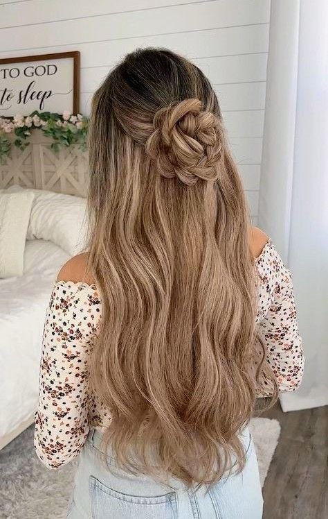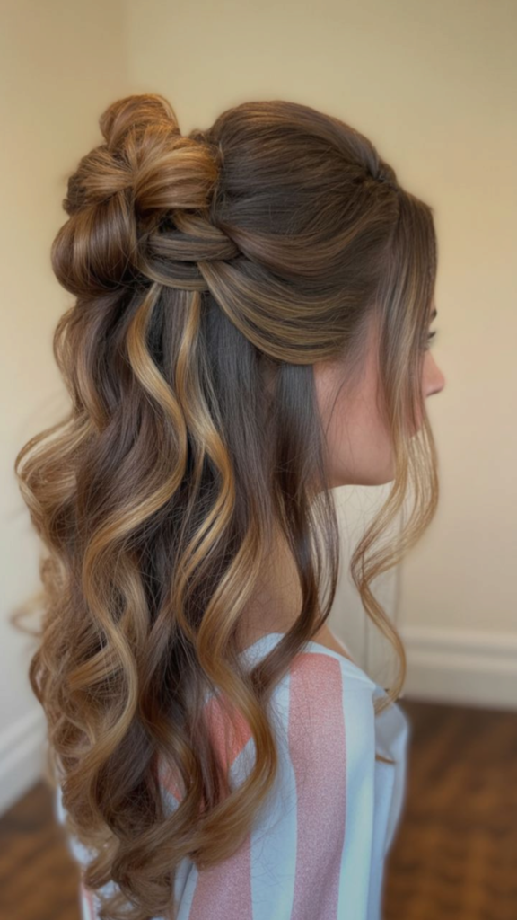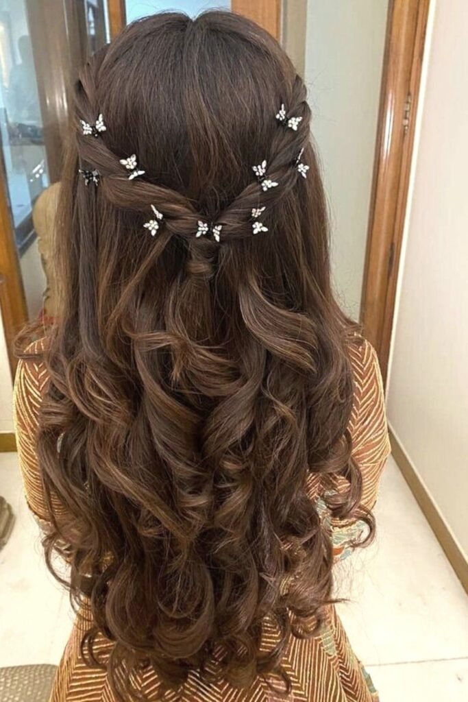 This one is pure magic and I absolutely love it. A classic twisted half-up look is taken to another level with dozens of tiny shimmering butterfly clips scattered all through the curls. It creates this enchanting, magical forest kind of vibe that is perfect for prom, a birthday celebration, or any wedding where you really want to stand out and have fun with your hair. Playful and beautiful at the same time.