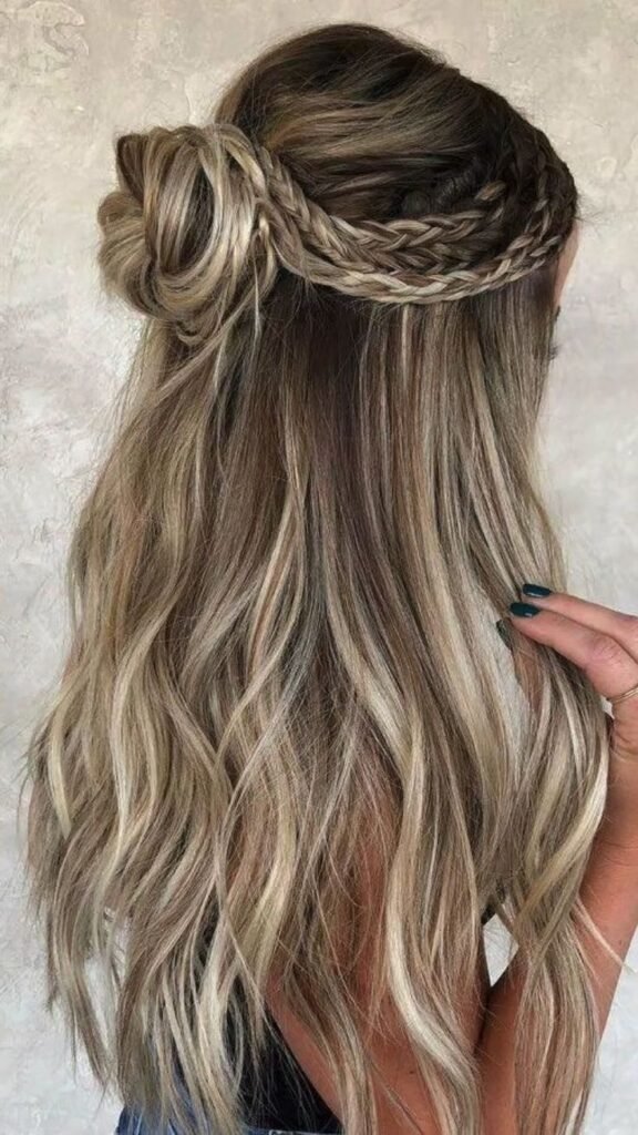 This is the style for the laid-back, sun-kissed bride who wants something relaxed but still really pretty. Two delicate Dutch braids wrap around the crown and meet in a soft half-up knot, while sandy blonde waves flow freely underneath. It showcases highlights beautifully and has this breezy, beachy quality that feels absolutely perfect for a casual outdoor ceremony or a summer wedding.