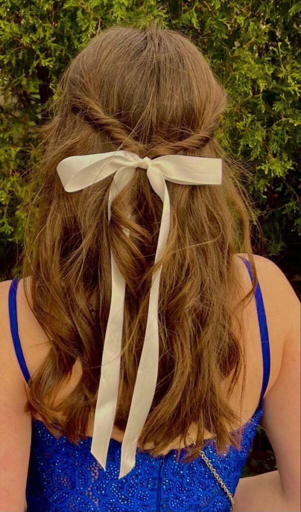 Simple, sweet, and so incredibly romantic. Two side sections are loosely twisted and secured at the back with a long flowing cream satin ribbon that adds the most beautiful feminine touch. The natural waves beneath it stay soft and full, and the ribbon just ties the whole look together in the most elegant way. It is giving coquette bridal and I am here for it completely.