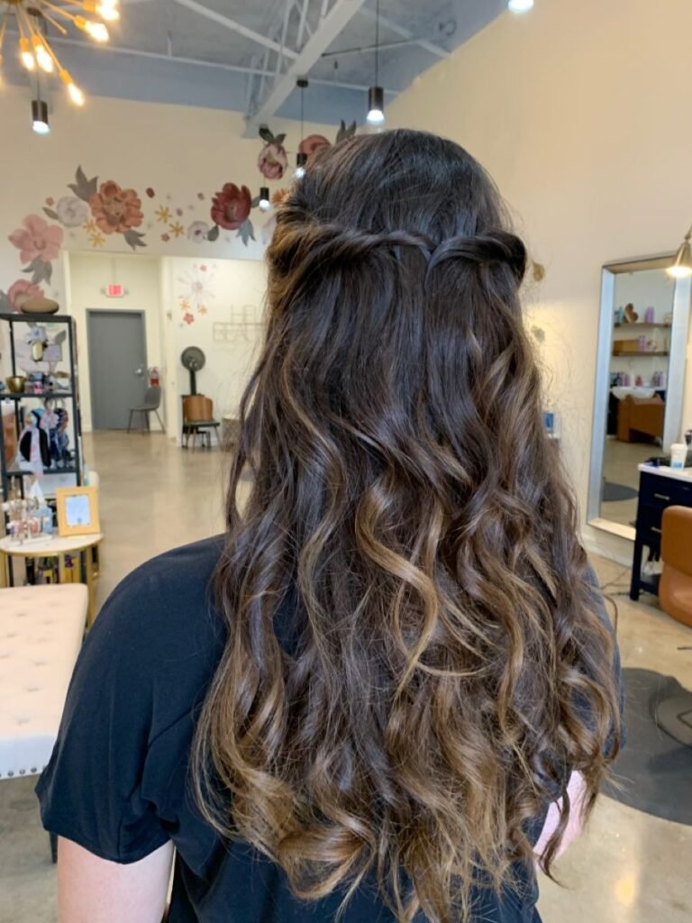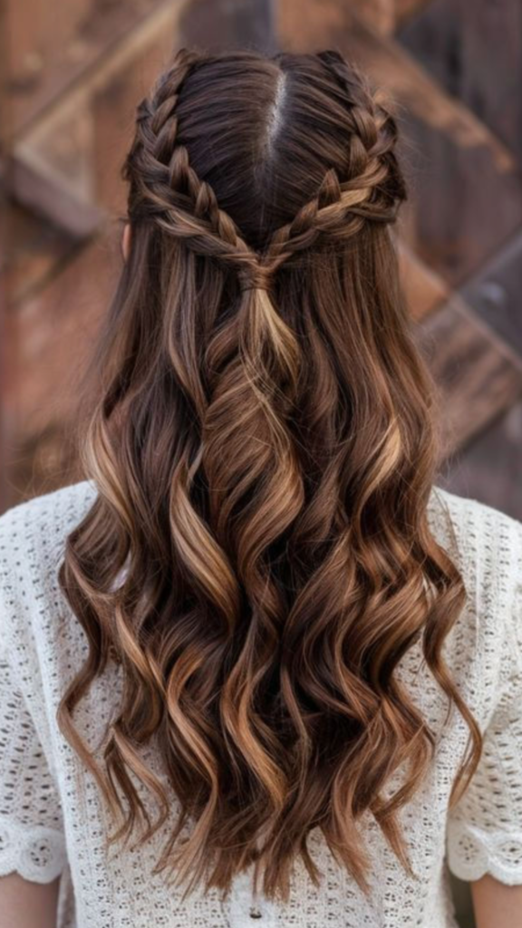 If you have highlights or multi-tonal hair, this style was practically made for you. A thick horizontal waterfall braid creates a beautiful divide between the smooth crown and the structured ringlets flowing below, and every loop of the braid catches the light to show off those gorgeous tones. It is breathtaking at outdoor weddings and absolutely luminous during golden hour photos.