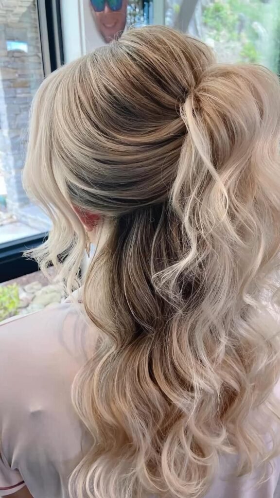 Big hair, big energy, big love. This style is all about massive, airy waves with a high-set half ponytail that gives incredible lift and volume. The icy blonde tones deepen beautifully within the shadows of the waves, creating this glamorous, red-carpet-ready finish. It feels effortless and high-impact all at once, which is honestly the dream for any wedding look.